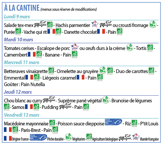 Les menus scolaires sont établis selon un plan alimentaire de 20 repas (5 semaines scolaires) rédigé sur la base de 5 composantes d’après les recommandations du Plan national Nutrition santé. Le plan national nutrition santé engage les collectivités à mettre en place des actions d’éducation et de sensibilisation aux règles de base de la nutrition. Le taux d’obésité en France et ailleurs étant en progression anormale chez les plus jeunes. Pour plus d’informations consulter le site https://solidarites-sante.gouv.fr/