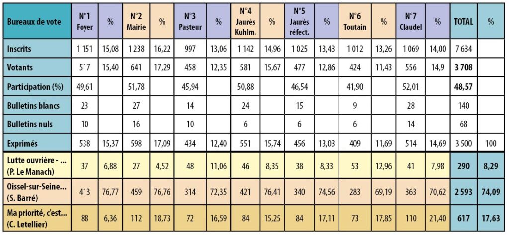 La liste Oissel-sur-Seine avec vous, pour vous conduite par le maire sortant, Stéphane Barré arrive largement en tête avec 74,09% des voix. Elle remporte donc l’élection dès le premier tour. Il n’y aura pas de second tour le 22 mars.